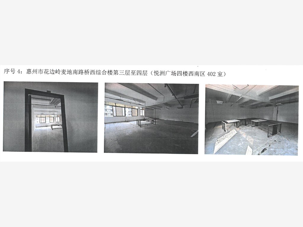 4.位于惠州市花边岭麦地南路桥西综合楼第三层至四层(悦洲广场四楼西南区402室)出租面积97平方米每月租金底价按高于评估价人民币2619元每两年租金增加5%,租赁期为年,押金为3个月的月租金。