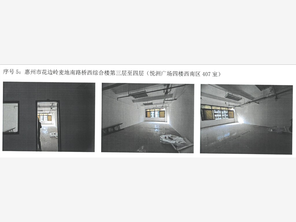 5.位于惠州市花边岭麦地南路桥西综合楼第三层至四层(悦洲广场四楼西南区407室)出租面积51平方米每月租金底价按高于评估价人民币1428元每两年租金增加5%,租赁期为年,押金为3个月的月租金。
